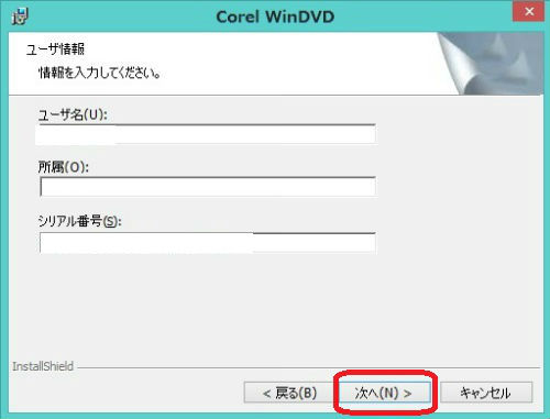 下記の画面では「ユーザ名」と「シリアル番号」は入っていませんが、自動的に入力されています、そのまま「次へ」をクリックします。