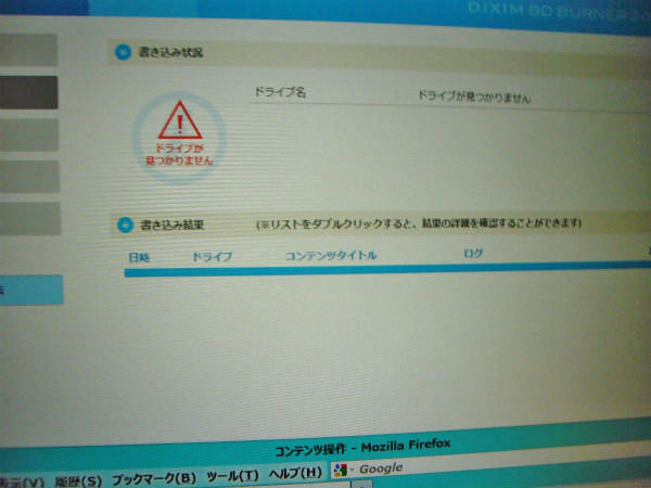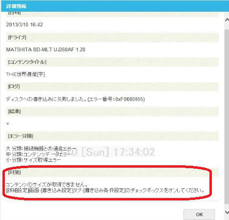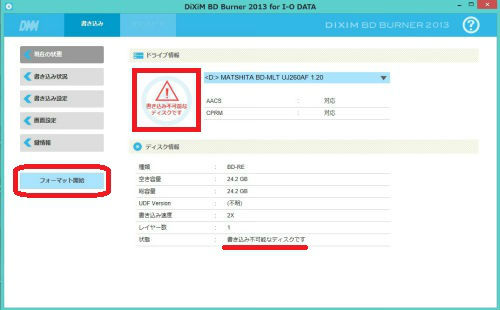 今回は、試験的に新品のBD-REで行っている為か「書き込み不可能なディスク」との表示がでました。