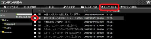 ダビングするNHKの番組等を編集したナショナルジオグラフィック番組にチェックを入れて、「ネットワーク転送」をクリックします。
