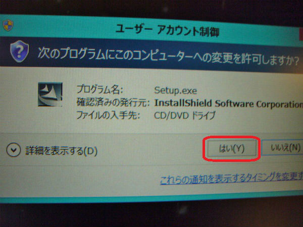 ユーザーアカウント制御がポップアップしますが、「はい」をクリックします。