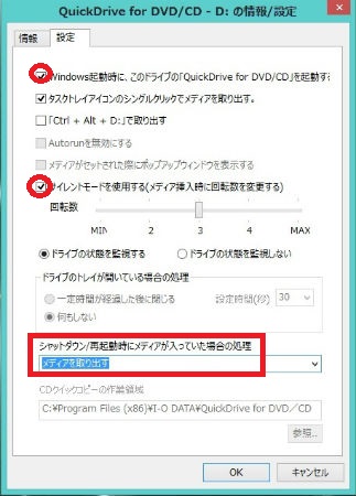 私の場合は、「Windows起動時に、このドライブの「QuckDrive for DVD/CD」を起動する」と、「サイレンとモードを使用する(メディア挿入時に回転数を変更する)」にチェックを入れ、そして先ほど失敗した様な事を防ぐ為に「シャットダウン/再起動時にメディアが入っていた場合の処理」を「メディアを取り出す」に設定しました。
