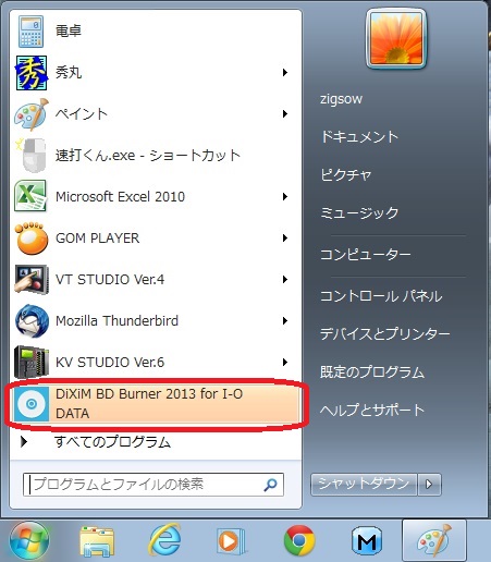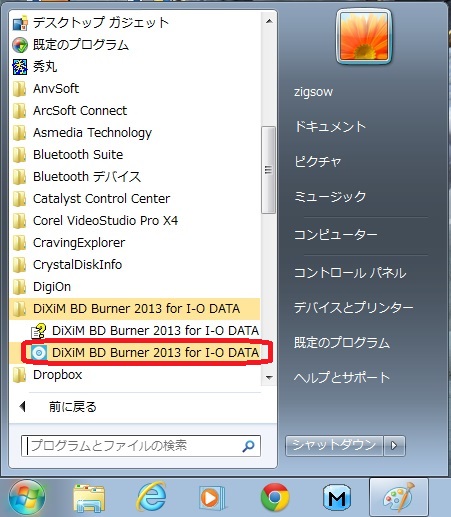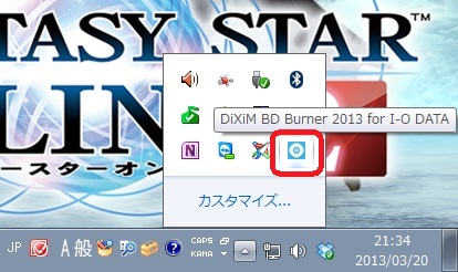下図のように、右下のタスクバーを表示するとDiXiM BD Burner 2013 for I-O DATAが起動しており、アイコンが表示されているのが確認できると思います。このアイコンを右クリックして、DiXiM BD Burner 2013 for I-O DATAを表示という項目を選択する事でソフトウェアを起動する事が出来ます。