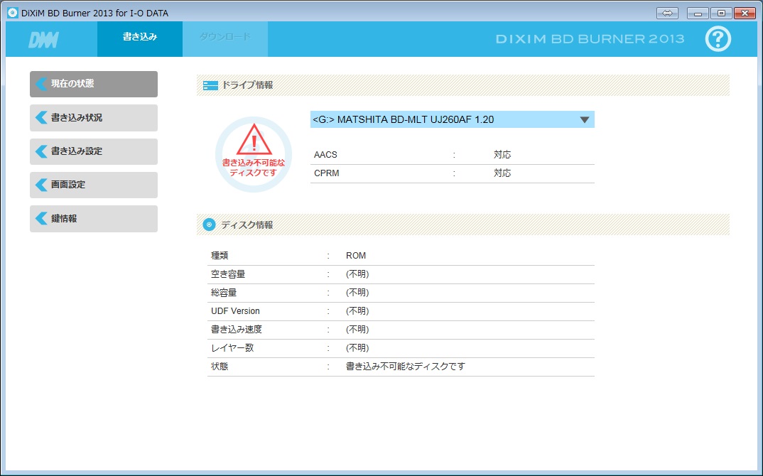 ディスクを挿入した時点でドライブ情報を見ると、「書き込み不可能なディスクです」となっていますが、この場合は、ディスク自体が書き込み出来ないという意味ではなく、「まだフォーマットされていないため書き込みの準備が出来ていません」という意味のようです。