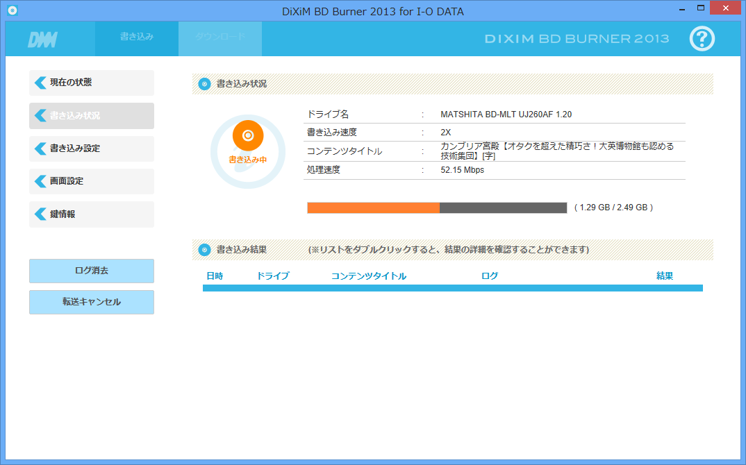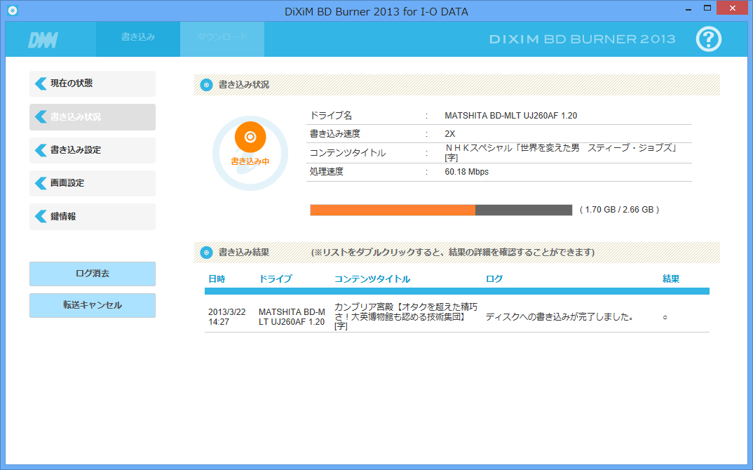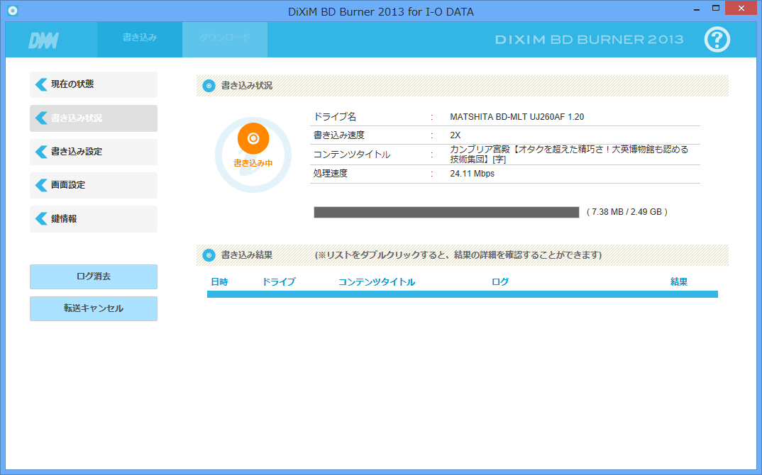 記録ビットレートはデフォルト値であるVBR 9Mbpsですが、2倍速書き込みで、若干のバッファリングしかしていないはずDLNAダビングでは、802.11n接続だと転送が間に合っていなかった可能性があるのです。