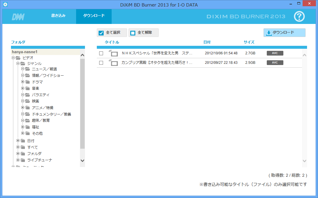 nasneは自分からダビング指示を出せない DLNAサーバーなので、DiXiM BD Burner側からダウンロードする必要があります。