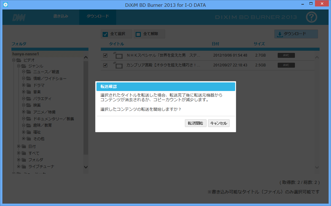 チェックをいれてダウンロードを押すとダイアログで、コピーワンスやダビング10など転送制限があるタイトルは、消去またはコピーカウントが減少されることが警告されます。