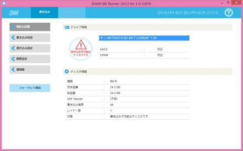 先ほどインストールした、「DiXiM BD Burner 2013 for I-O DATA」を起動します。