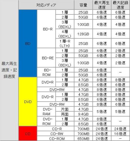 書き込み速度は、一層のBD-Rで6倍速。こちらは四層のXLにも対応しており、XLだと4倍速の書き込みになります。