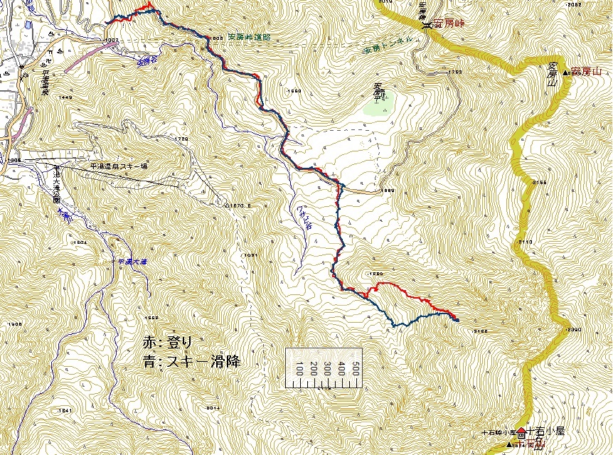 平湯温泉のアカンダナ駐車場への入口付近が除雪終了点なので車を停めて山スキーで登ります。 下りは、アルペンスタイルでスキー滑降で下山します。