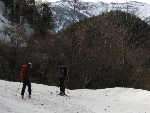 雪も腐っているし、木と木の間隔も狭く注意が必要である。しかも、降り口の藪がうるさい。