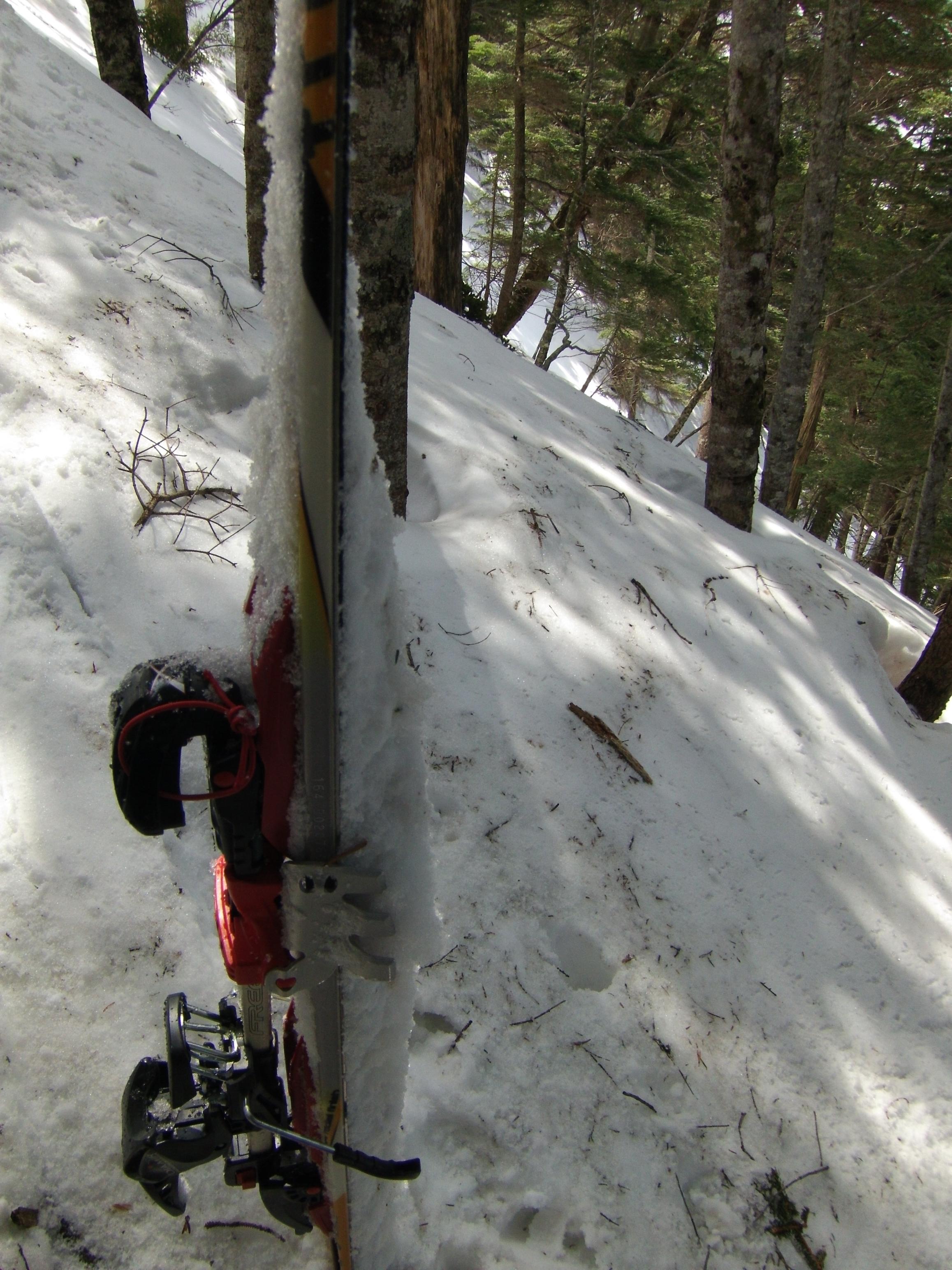 ご覧のように、クトーの刃先より、シールに張り付いた雪の方が厚い。この日でも、多い時はこの倍の厚さにもなり、スキー板が重くなる。まるで筋力トレーニングだ。