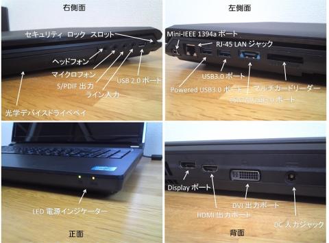 ・外部出力端子:ヘッドフォン/スピーカ出力×1、マイク入力×1、ライン入力×1、S/PDIFアウト(ミニプラグ型)×1、USB 3.0ポート×2、USB 3.0/eSATA兼用ポート×1、USB 2.0×1、ディスプレイ出力(DVI-I)×1、HDMI×1、MINI IEEE1394a×1、DisplayPort×1