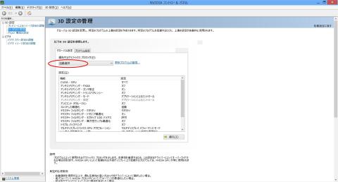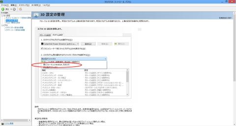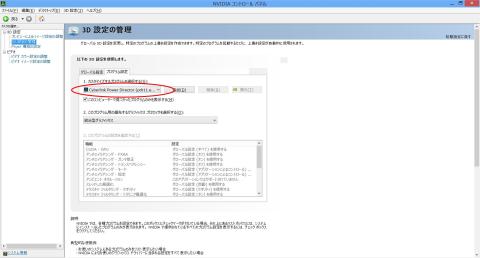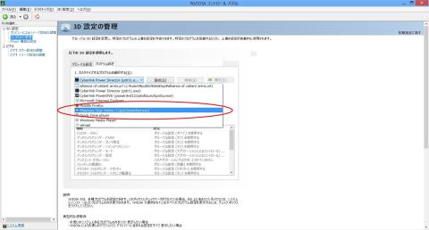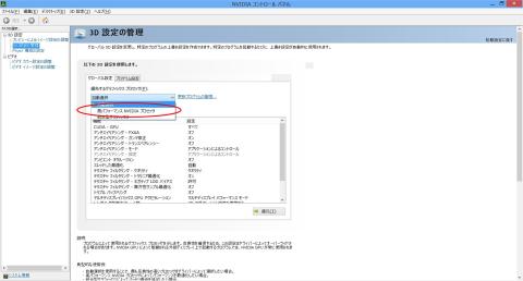 プログラム設定の「カスタマイズするプログラムを選択する」から希望するプログラムを選択(なければ追加する)し、「このプログラム用の優先するグラフィックス プロセッサを選択する」を「高パフォーマンス NVIDIA プロセッサ」にする。