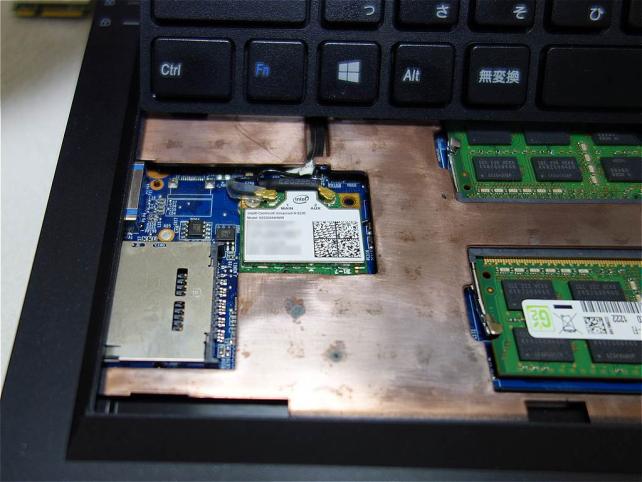 既設のメモリ(4GB×2枚)には、本体底部のカバーを外すことで簡単にアクセスすることができるが、実はこの機種にはキーボード下に更に2枚分の空いたメモリソケットがある。メモリソケットの左側に見えるのが無線LANモジュール。