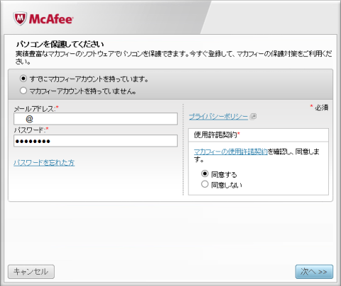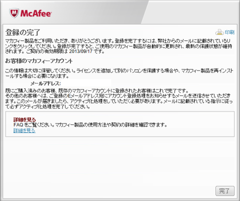 登録用のソフトウェアがインストールしてあるだけで本体はインストールしていないみたいです。アカウント登録を行った場合はメール認証でマカフィーのサイトにログイン、ダウンロード、インストールという流れなのかもしれません。マカフィーのサイトにログインしてみたらこんな表示だったので再インストールを押してセットアップを行います。