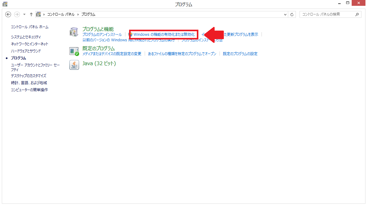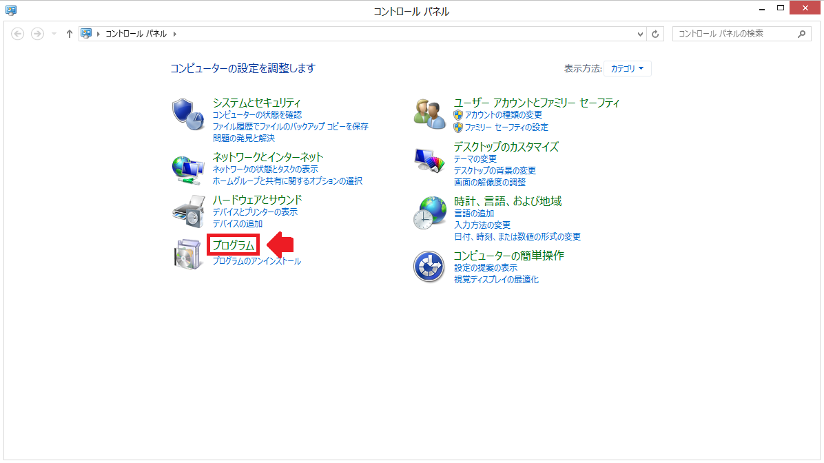 1:まず初めに標準状態で無効にされているHyper-Vを有効にするために、コントロールパネルを起動します。その次にコントロールパネルの中から、「プログラム」を選択します。