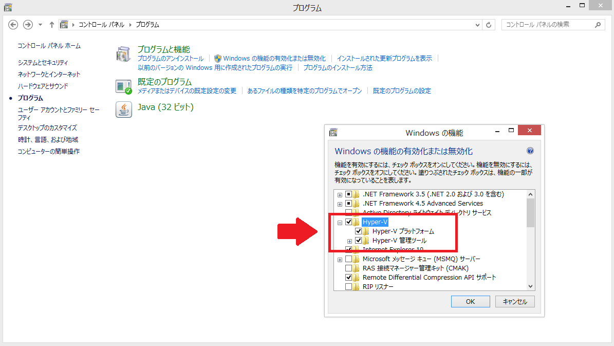 3:表示されたウィンドウの中の「Hyper-V」が有効化されていないので、チェックを入れて有効化します。