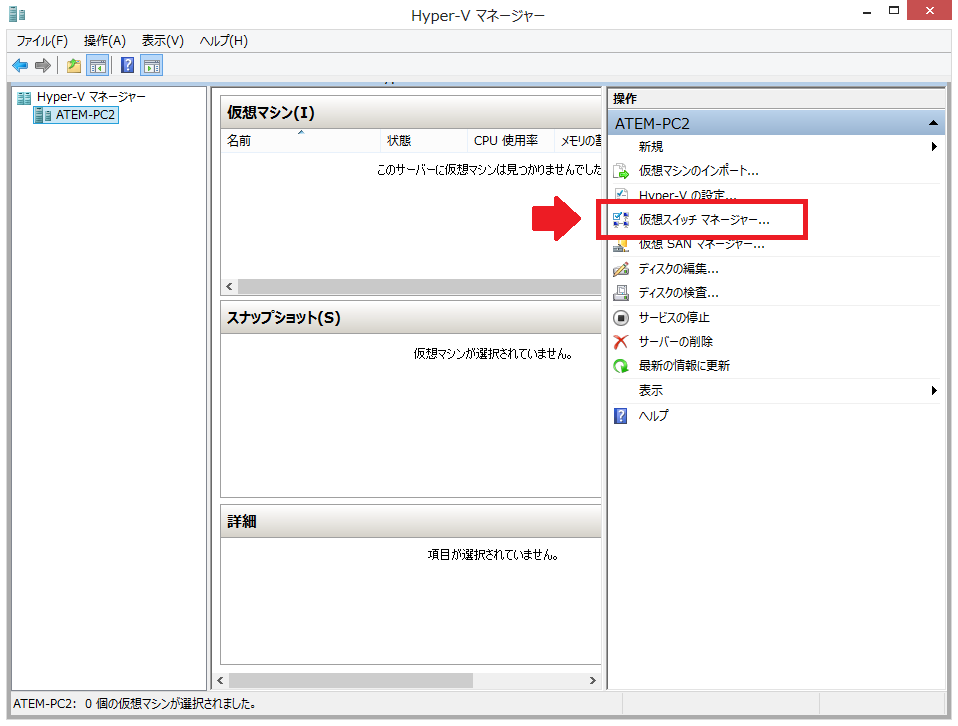 6:仮想マシンのためのネットワークアダプタを作らないと通信ができないので、表示された「Hyper-V マネージャー」の「仮想スイッチマネージャー」を開きます。