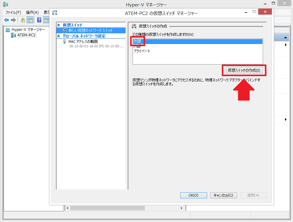 7:「外部」を選択して、「仮想スイッチ」の作成をクリックします。