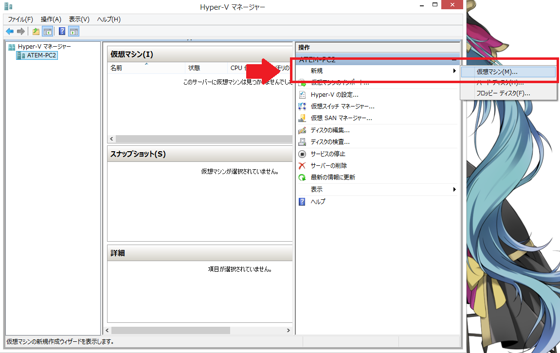 9:ネットワークアダプタの作成が完了したので、仮想マシンの作成に入るので、「新規」から「仮想マシン」を開きます。