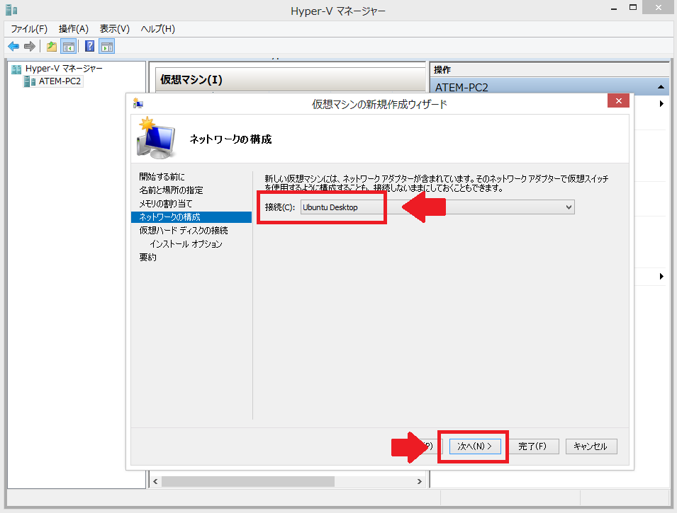 13:ネットワークの接続を「8」で作成した「Ubuntu Desktop」を選択し、「次へ」をクリックします。