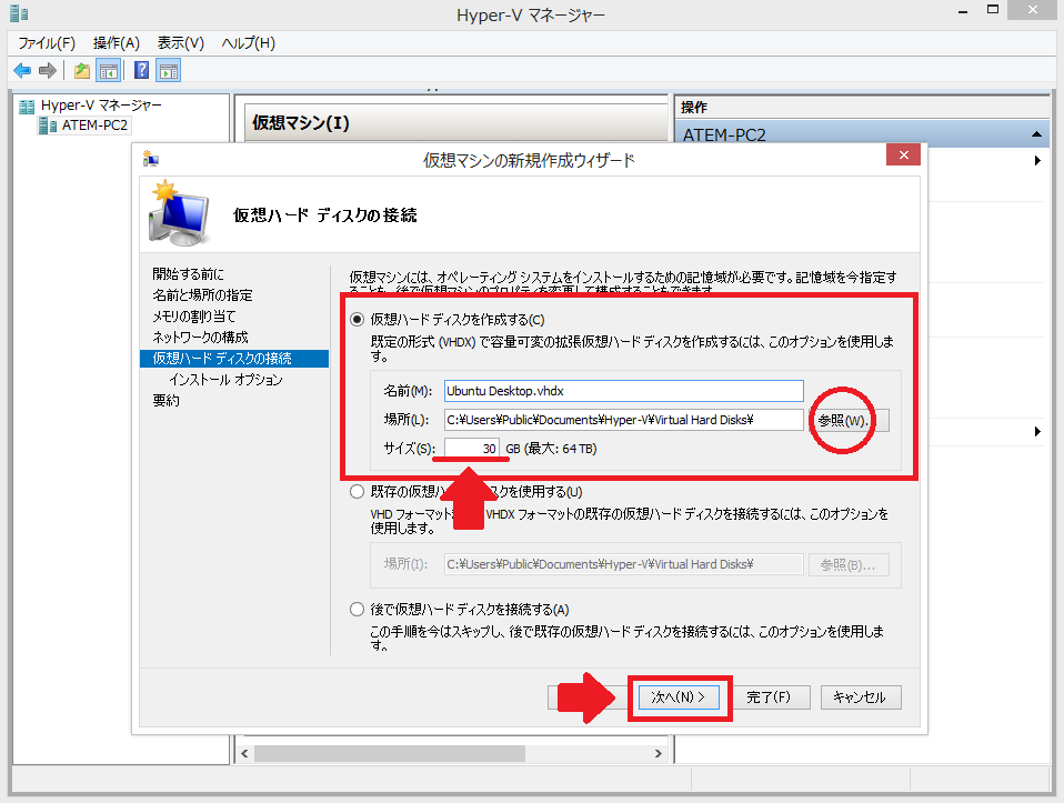 14:保存領域の作成がされていないので、「仮想ハードディスクを作成する」にチェックをいれ、「名前」と「場所」、「サイズ」を指定します。