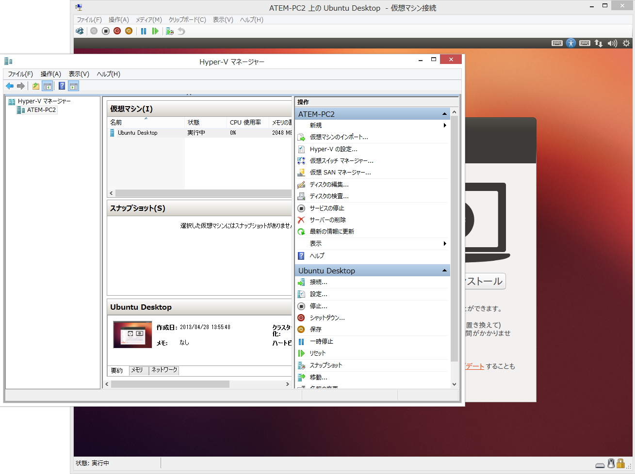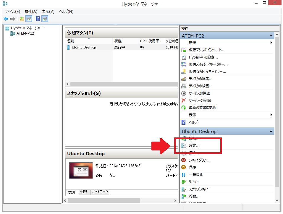 設定は「Hyper-V マネージャー」に表示されている「設定」から行えます。