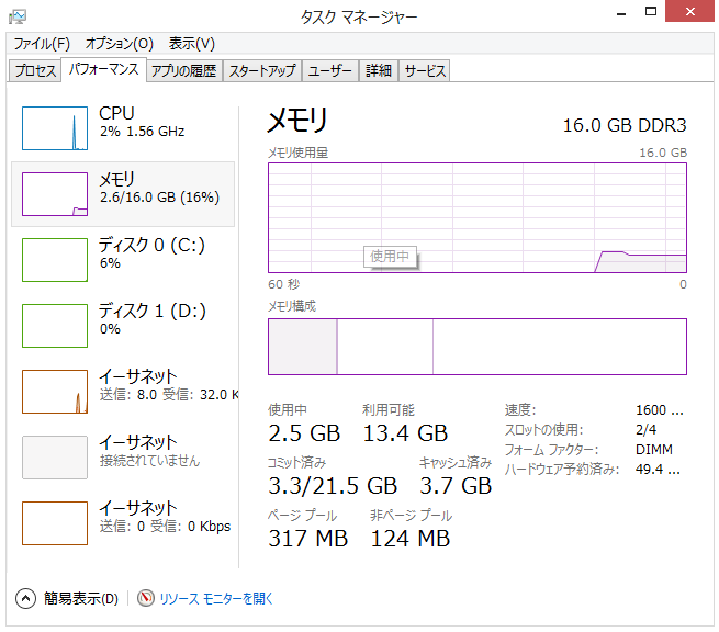 ちなみに、平常時の使用メモリ、CPU使用率はこのような感じです。