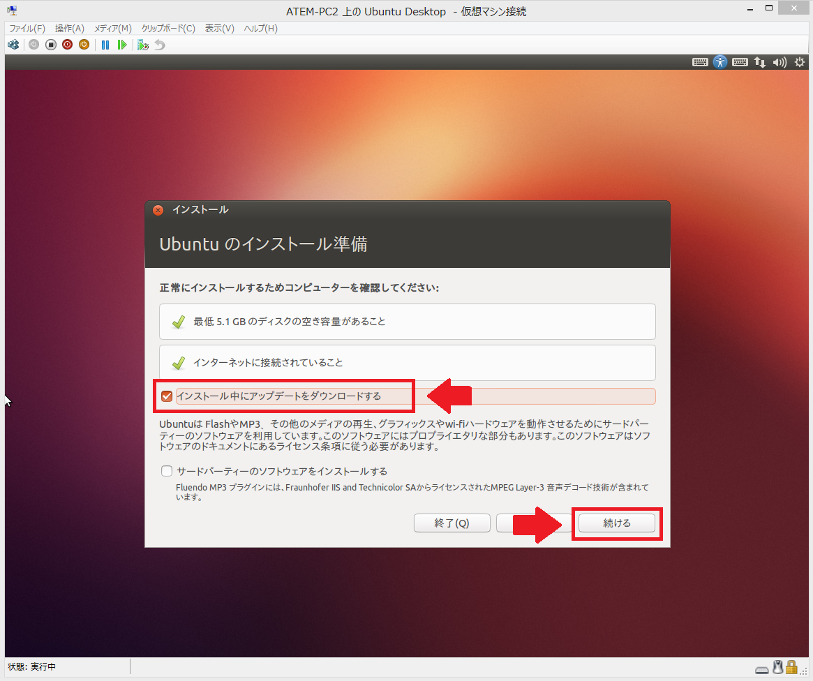 1:Ubuntuのインストールを選択、仮想ネットワークが存在するので、「インストール中にアップデートをダウンロードする」を選択します。
