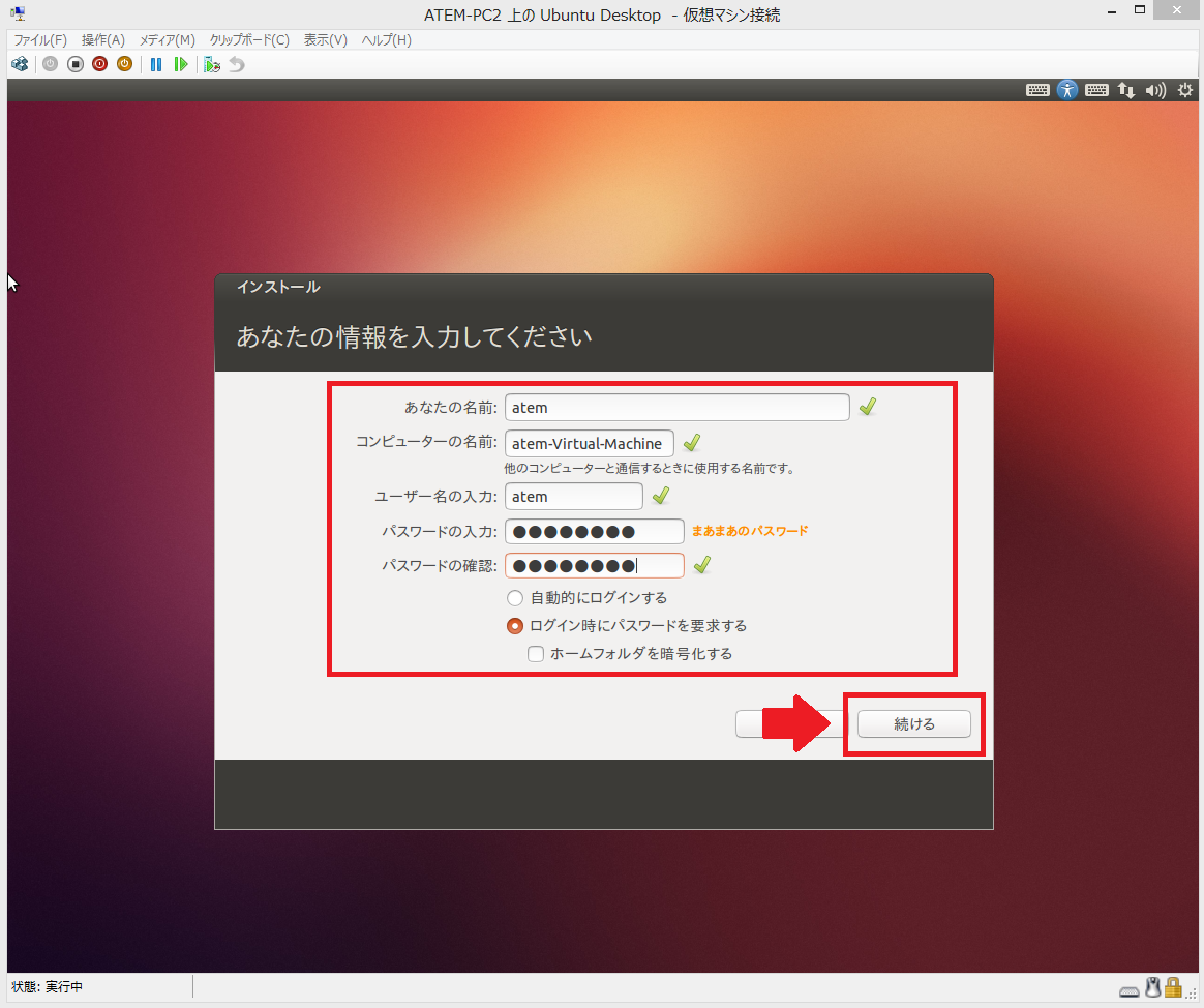 3:「名前」「コンピューターの名前」「ユーザー名」「パスワード」を指定し、「続ける」をクリックします。