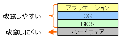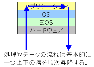 最下層をハードウェアとしその上にBIOSやドライバ、OS、アプリケーションが積み重なります。基本的には一つ上下の層を介して、処理やデータは受け渡しされます。