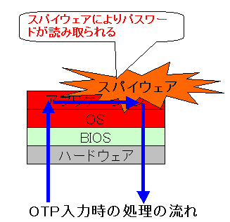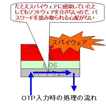 IPTを使った場合、OSより上層にはOTPの受け渡しは行われませんので、スパイウェアに読み取られる心配がありません。