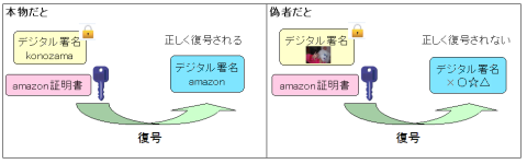 証明書に添付されている公開鍵で、デジタル署名を復号することにより本物かどうかを確認することができます。公開鍵で復号したデジタル署名がamazonであれば信頼のおける署名であると確認することができます。