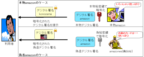 ただの署名では簡単に偽造できてしまい、誰でもamazonを名乗れるので、秘密鍵という本物のamazonだけが所有する鍵でデジタル署名は暗号化されています。