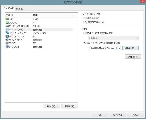CD/DVDをポチッと押して、接続の所のISOイメージファイルを使用する、の参照ボタンを押して、ブートイメージのdarwin_snow.isoを指定する
