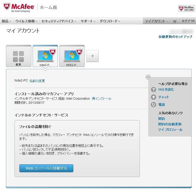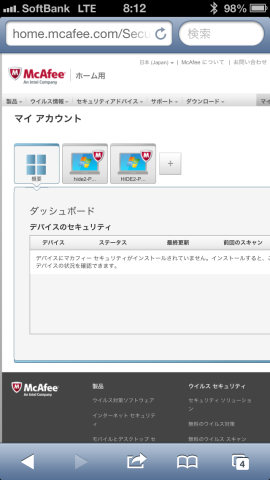 まずは、何か他のパソコンを使ってMcAfeeアンチセフトサービスのページに行きアカウントページを出して、Webコンソール 画面を出します