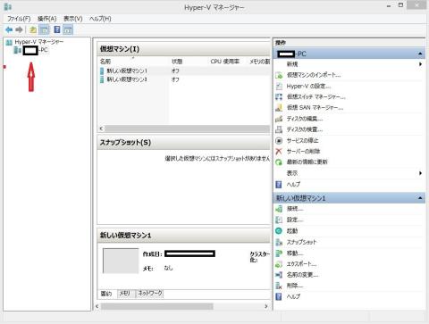 2.本来なら、Hyper-V マネージャーのウィンドウが開いたら、画面左側にあるコンピューター名を 右クリックして、[新規]-[仮想マシン]とクリックしますが、現在2台の仮想マシンが、インストール済みですので、途中の設定等は、上記サイト参照お願いしまして、割愛させていただきます。
