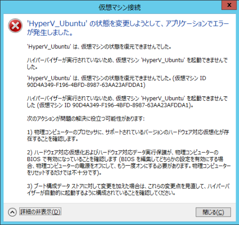 WS2012+Hyper-Vのときと同様、VT-xをオフにすると仮想マシンを起動できませんでした。Hyper-V同様、VT-xは仮想化の根幹をなしているようです。