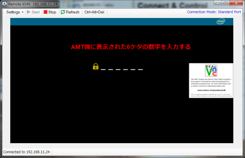7.KVMビューワースタンダードを起動してみよう!パスワードを聞いてくるので、AMT機に表示された数字6ケタのパスワードを入力します。