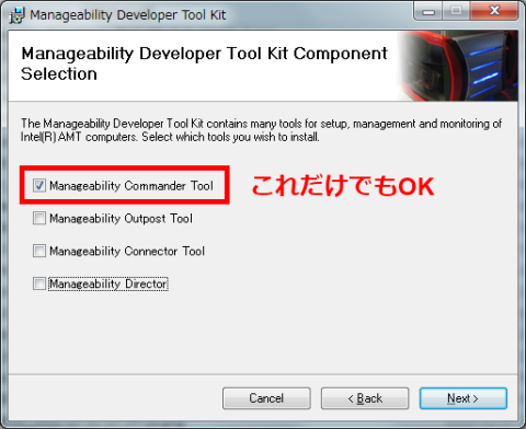 4.Manageability Developer Tool Kit BinaryをクライアントPCにインストールします。その際、Manageability Commander Toolだけチェックするのもアリです。