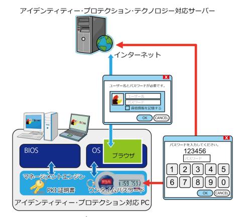 インテル アイデンティティー・プロテクション・テクノロジーに対応している第2世代以降のインテル Core プロセッサーおよびマネージメントエンジンを搭載したPCでは、マネージメントエンジン上に、ワンタイムパスワードを生成するトークンの機能を盛り込むことが可能で、マネージメントエンジン上のチップセットで処理されるため、安全性が向上します。