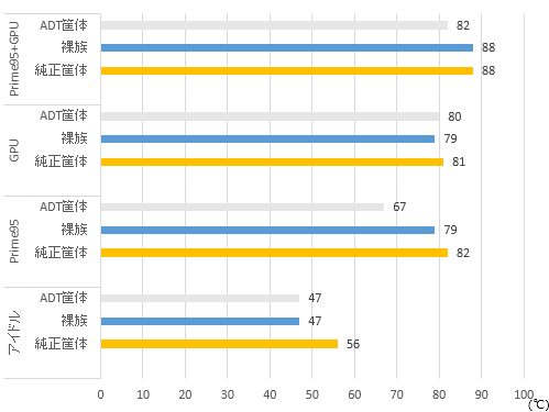 いくら17Wという低TDPでも、こんな小さい筐体に収まっていたら熱かろう…ということで、◆純正筐体 ◆裸族(マザーボードを引っ張りだしてそのままの状態) ◆ADT筐体(↑の機器に組み込んだ状態)で、アイドル,Prime95,GPU負荷,Prime95+GPUの状態で温度を測ってみました。室温は28℃(←やたら暑い気がするが、気にしない)。