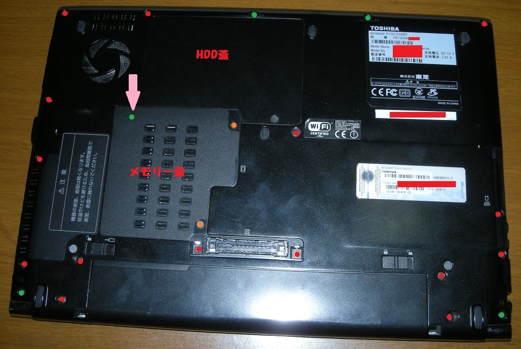 バッテリーを外した後、赤・緑・橙のネジを外します。ピンク色のやじするの部分にネジが隠れているので壊さないように注意しましょう。