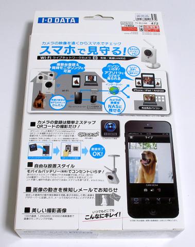 パッケージの表は、「スマホでWatch パソコンいらず!アプリ1つですぐに見られる」と簡単に使えることが中心に書かれています。パッケージの裏は、「カメラの映像を遠くからスマホでチェック スマホで見守る!」と機能が書かれています。説明はペット(犬)の見守り中心です。IO-DATA様の製品は、犬を使うことが多い気がします。---------------------------------------------------------------------