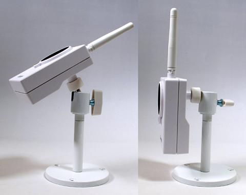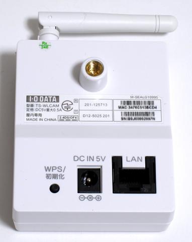 前面にはカメラとカメラの下に状態表示のランプがあります。裏面は、スタンド固定穴、LANコネクタ、電源端子、WPS/初期化ボタンがあります。本体サイズは、iPhone5(モックアップ)より少し小ぶりです。スタンドに固定した状態では、写真より下向きにはなにません。上向きは真上まで向きを変えることができます。