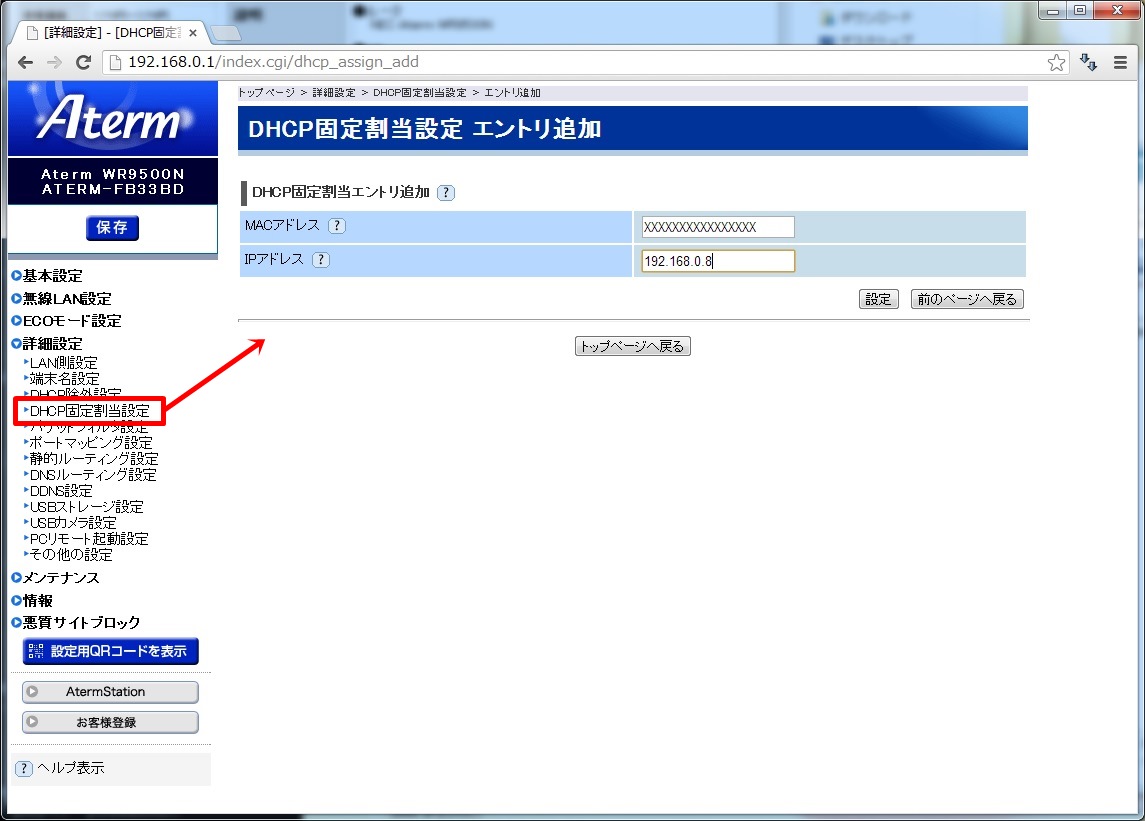 「詳細設定」を押下し、「DHCP固定割当設定」で追加画面を開いた所です。
