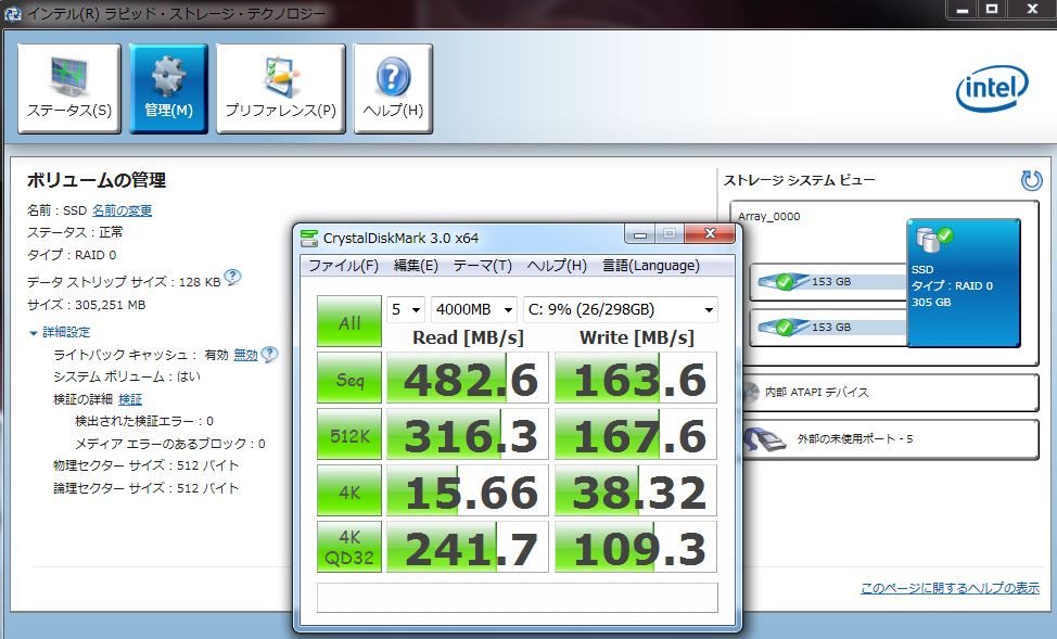 RAID0で300GBくらいなのでバックアップを取るにも大した容量ではないと思いつつ、ノートパソコンではUSBドライブでも使わない限りは搭載容量が全容量なので速度と容量+耐用のどちらを選ぶかは人それぞれ。