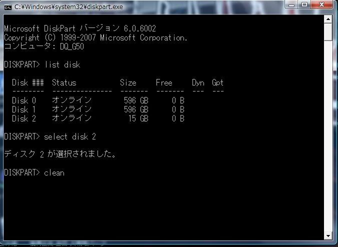 ここでも 「DISKPARTはディスクを正常にクリーンな状態にしました」 と表示されました。
