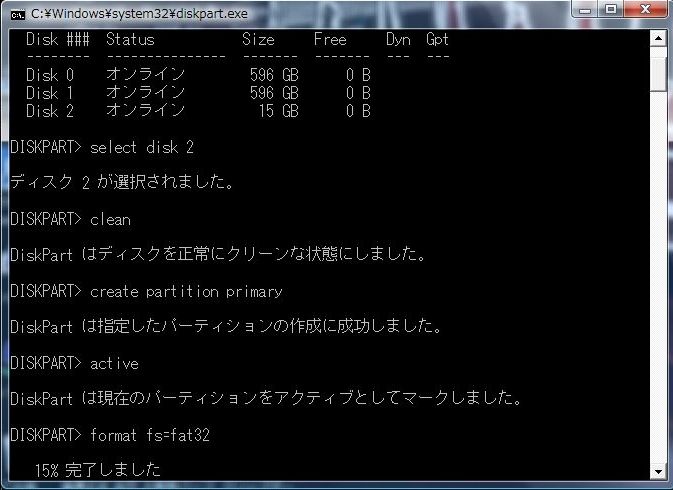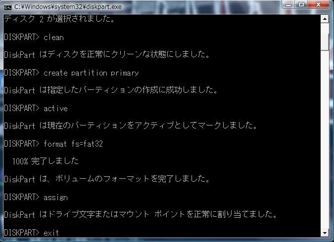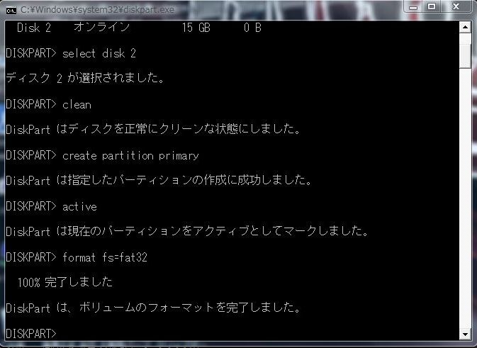 「DISKPARTはボリュームのフォーマットを完了しました」 と表示されました。