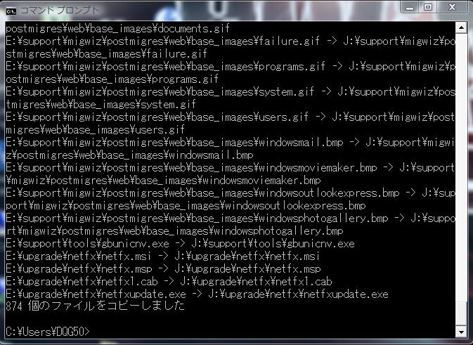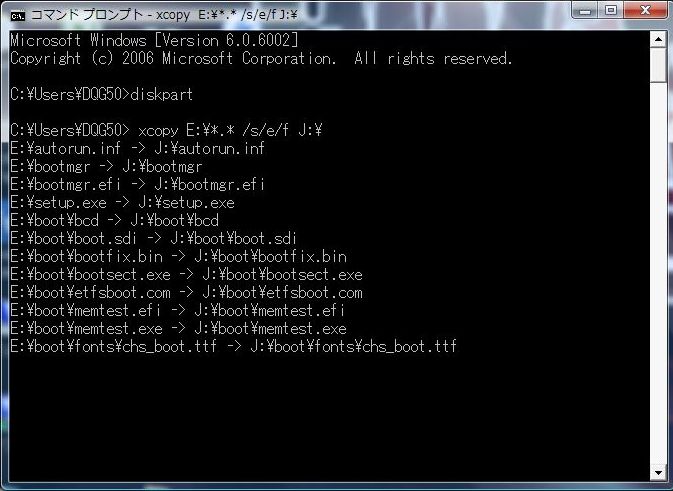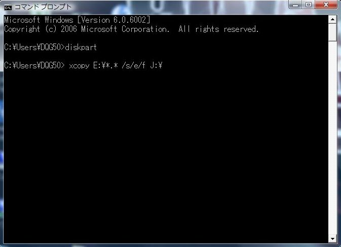 次に xcopy E:|*_* /s/e/f J:\ と入力します。